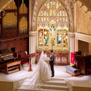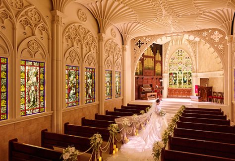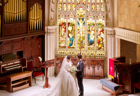 格式あるステンドグラスに見守られて愛を誓う